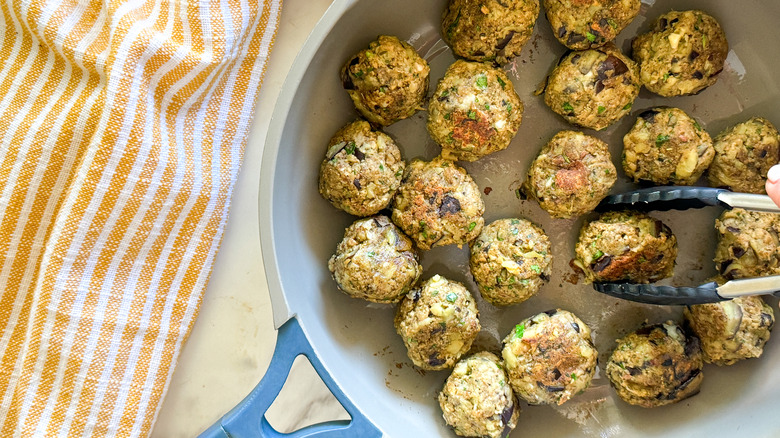 - Add the eggplant balls to the pan and sear all sides for 5 minutes.