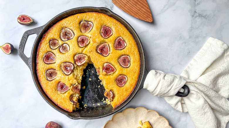 Figs are stunning fruits, and when you dot them over the surface of your cornbread, they add plenty of visual appeal to the classic dish. This sweet creation is great for serving as an after-meal treat or at tea time.