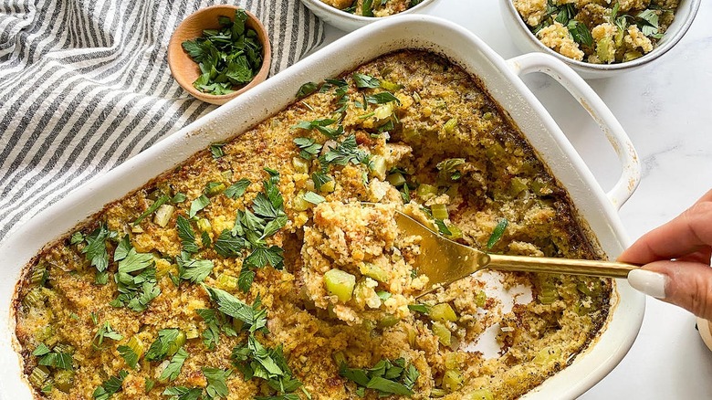 Making dressing (aka stuffing) from scratch might seem like a hassle, but there's no doubt the results are worth it. Start by making a basic cornbread recipe (this one is sweetened), then... deconstruct it. Crumble it into bits and combine them with alliums, broth, seasonings, and eggs.