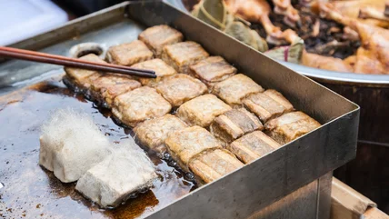 One such example is hairy tofu, also called mao doufu. Hailing from the Anhui province in eastern China, the food is a local fermented delicacy. Prepared by generational makers, it starts with firm tofu, which is then stored in wooden boxes at a designated temperature and environment. Aged for up to six days, the tofu develops a blue-cheese-like quality but with sprouting hairs jutting out from the soy block. It's then cooked into varying dishes, typically involving frying. And despite its impressionable appearance, hairy tofu has a mildly tangy flavor, backed by a tender, moist interior. It's a fermented product that's both a fascinating culinary practice and a treat to enjoy.