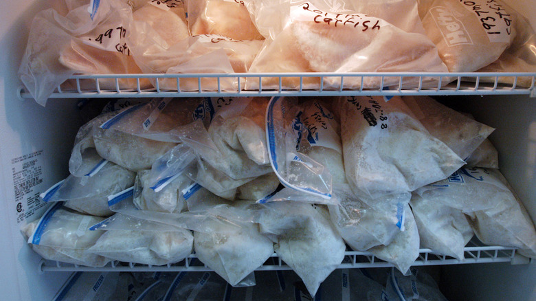 Pretreating fatty fish requires a 20- or 30-second dip into a solution of ascorbic acid and water, while lean fish need the same amount of time in a brine of salt and water. The fish then goes unwrapped into the freezer until frozen solid, then removed and dipped into a bowl of ice water — then frozen again. Repeat the process as many times as necessary until a visible sheet of ice encapsulates the fish, naturally preserving it until you're ready to oven-bake, pan-fry, smoke, or grill that fish to tasty perfection. Just be sure to wrap the final ice-glazed fish in freezer-proof paper or high-quality freezer bags until removal.