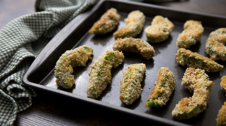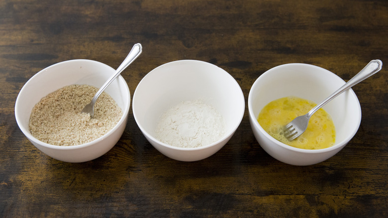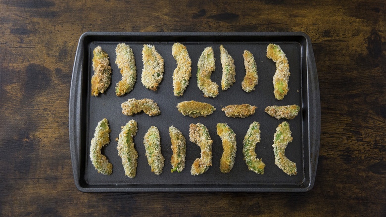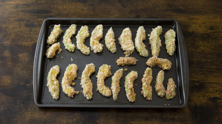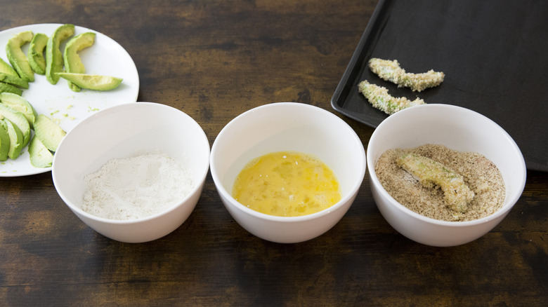 The breading technique used in this recipe calls for flour, eggs, and panko breadcrumbs. However, if you're following a plant-based or gluten-free diet, you don't have to miss out on these delicious, creamy, and crunchy avocado fries. If you'd like to replace the egg, you have several options. You can use milk or yogurt instead, and this includes non-dairy options like almond, coconut, oat, or soy varieties. A mixture of tapioca starch, cornstarch, or ground flax seed and water creates a sticky liquid similar to an egg. You can also use a simple mixture of oil and water to help the breadcrumbs stick.