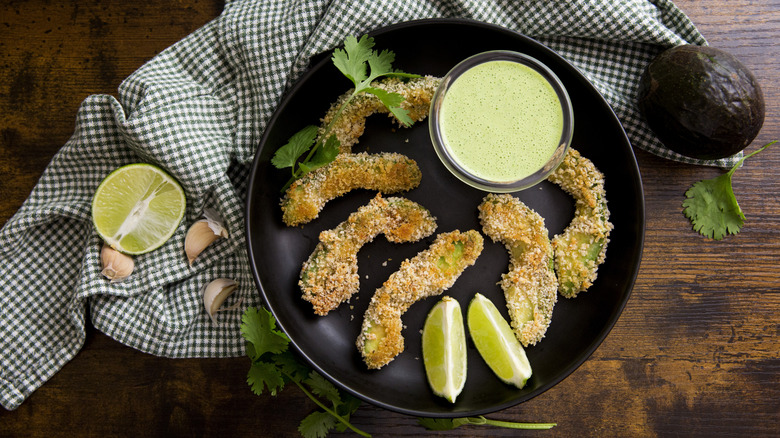 The concept of avocado fries might seem odd at first — after all, we often use avocados when they're very soft and ripe, and that couldn't be farther from the firm potatoes usually used to make fries. As it turns out, soft, buttery avocados make for great fries, especially when you coat them with crunchy breadcrumbs. With a crispy, seasoned outer coating and a creamy interior, they're perfect for a unique appetizer, a side dish, or a filling snack.