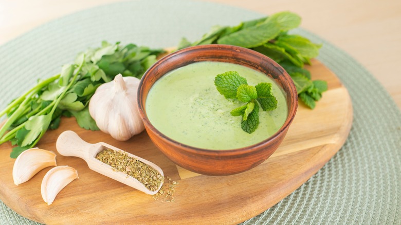 Sometimes, additional herbs are added, and occasionally, huacatay (black mint) is added to the mix. Ají peppers can be tough to track down in the United States, but don't worry; jalapeños make an acceptable substitute. Jalapeños can also be swapped in if you're hesitant about the spice level — even though mayonnaise cools things down a bit, this is still a truly spicy sauce. Ají verde harmonizes beautifully with grilled meat, fish, and poultry, is fantastic on tacos, and can be drizzled on top of empanadas or pupusas.