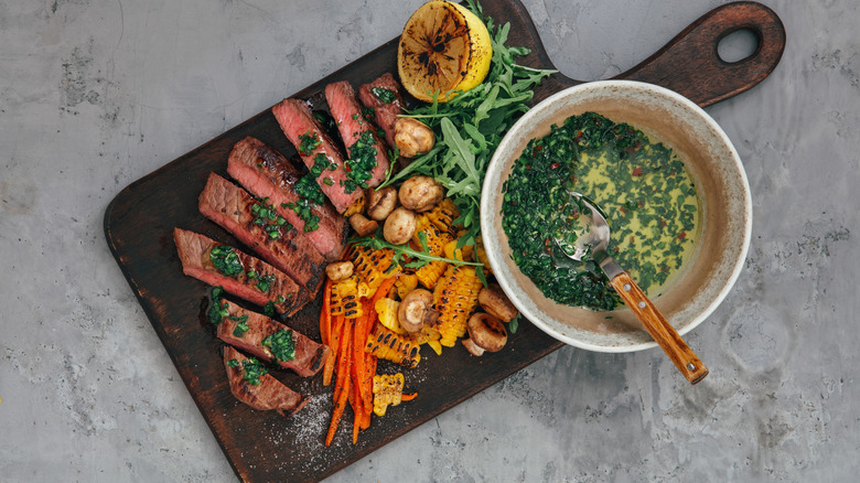 Chimichurri has likely gained a large portion of its notoriety due to its ties to steak — the vibrant, botanic, and zesty sauce pairs beautifully with a nice juicy ribeye or a beefy New York strip, but honestly, it works well with just about any type of grilled meat you can think of. Chimichurri is a versatile salad dressing that makes a nice taco topping. Heck, put it on pasta and have a light, flavorful dinner on the table in minutes.