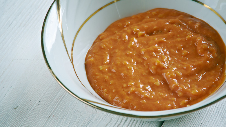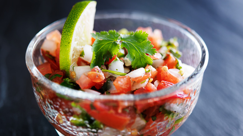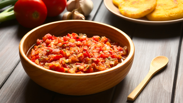 If you're a pico de gallo fan, then you simply must try pebre. Pebre is a fresh Chilean salsa made by mixing oil, diced tomatoes, diced onions and scallions, fresh chile peppers, garlic, cilantro, and a dash of salt and pepper. We know — it sounds almost exactly like pico; the primary difference lies in the inclusion of hot peppers and scallions in pebre. Incorporating zippy peppers like ají or jalapeño gives pebre a nippy heat that makes this Chilean sauce a cut above the rest. It's spicy, sure, but carries a nice juice and acidity from tomatoes, pungency from the aromatics, and freshness from the herbs, too.