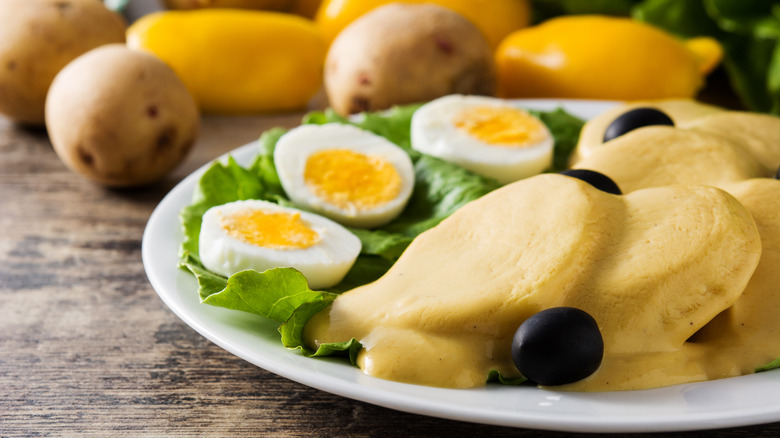 Ají amarillo is a Peruvian chii pepper used frequently in Peruvian cuisine — in fact, it's one-third of Peru's holy trinity, along with garlic and red onion. These peppers grow in abundance all over Peru, so it's no surprise they're incorporated into many of the country's traditional dishes. Ají amarillo is featured in the aforementioned ají verde sauce, but it's the star of the show in ají amarillo sauce. In this sauce, ají amarillo peppers are joined by mayonnaise, Greek yogurt or sour cream, queso fresco, scallions, lime juice, and ketchup for a creamy concoction with a considerable amount of heat.