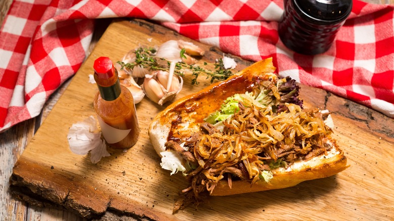 For home cooks, debris po'boys can be made with the fall-apart chuck roasts, briskets, or even pork roast that come out of the crock-pot, Dutch oven, or pressure cooker reheated in their juices. The result of reheating meat in their drippings is an ultra-moist, melt-in-your-mouth sandwich filling that brings a decadent au jus element to pair with the po'boy's French bread. You could apply a debris twist on a classic French dip sandwich by leaving the chuck roast in the au jus instead of separating it into a dipping sauce. Plus, adding cheese and caramelized onions would provide a wonderfully rich, creamy, and sweet contrast.