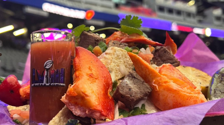 Have you ever wondered what it's like to live the suite life? A ticket alone to Super Bowl 58 on Sunday, February 11, 2024, will set the average buyer back about $8,345 on average, according to data from Vivid Seats. But for those willing to spend a casual $2.5 million on a luxury suite, witnessing the showdown between the Kansas City Chiefs and the San Francisco 49ers in style isn't all you'll get to enjoy. Arguably the biggest perk of the suite is the array of fancy dining options involved — and, as Luke Sawhook's post on X (formerly Twitter) demonstrates, Allegiant Stadium's menu in Las Vegas isn't holding back.