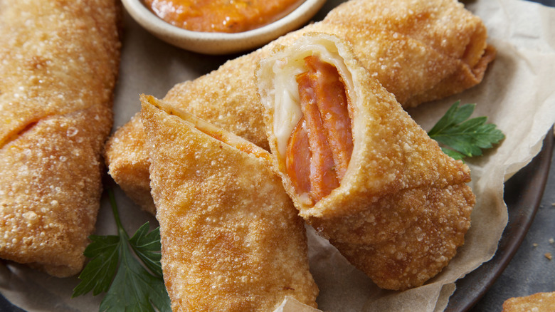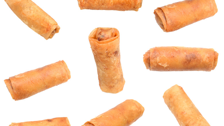 If the oil is too cool, you're likely to get greasy, sticky egg rolls. If it's too hot, they could emerge burnt on the outside and not fully cooked on the inside. Measuring the temperature of the oil using a purpose-built thermometer is useful. Alternatively, according to Tasting Table recipe developer Michelle McGlinn, you can tell if the oil isn't hot enough if it doesn't immediately bubble when the egg roll is added.