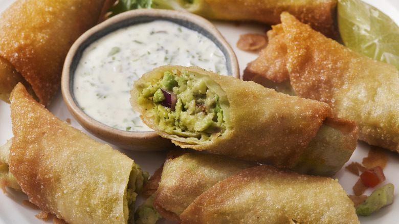 There's nothing wrong with a classic soy sauce or rice wine vinegar, soy, and sesame blend, but if you're eating meaty egg rolls, you can draw inspiration from the type of meat when choosing your sauce for a next-level feed. The sweetness of apple is exceptional with pork, so you could opt for a fruity sauce with your pork egg rolls like Duck Sauce, which is made with Turkish apricots. A zesty yuzu mayo could make chicken egg rolls pop, and a garlic-based sauce like aioli, hot sauce, or chimichurri could be a treat with seafood egg rolls.