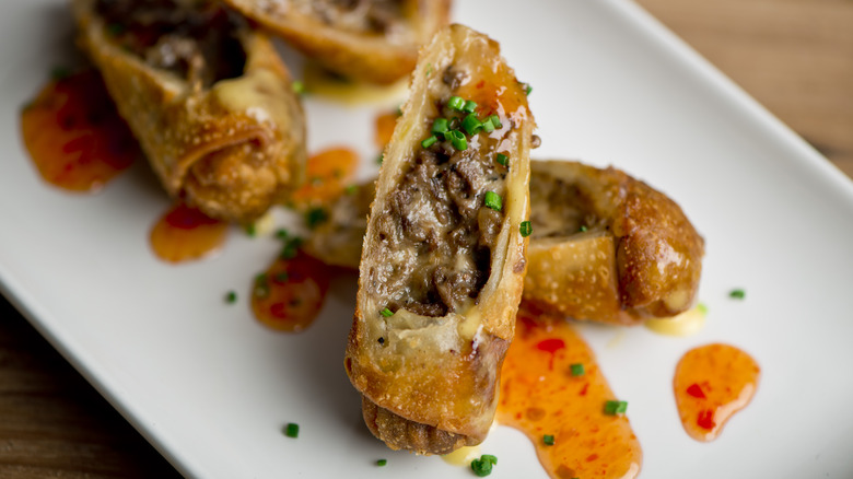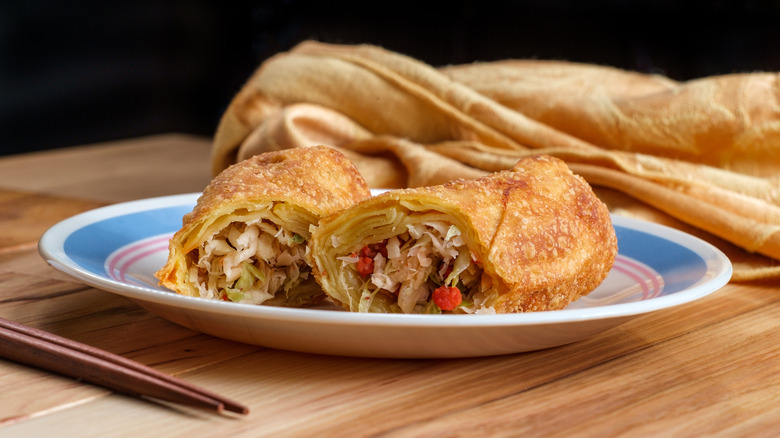 There's nothing humble about the Chinese American takeout-style egg roll. Bold, bubbly, blistered, and with a crunch deserving of its own Richter scale, it holds its own against any deep-fried snack. A welcome appetizer, or, indeed, a full meal in its own right, egg rolls — which don't necessarily need even to contain eggs — are welcome on any plate. While its origins remain disputed, author of "Chop Suey: A Cultural History of Chinese Food in the United States" Andrew Coe, suggests the first egg roll could have sprung into existence on an auspicious day in the 1930s in some deep fryer basket at a Chinese restaurant in New York City. Equally possible, egg rolls may have evolved from Dan Gun instead (which literally translates to 'egg roll'), a Chinese American snack where fillings are wrapped in an omelet.