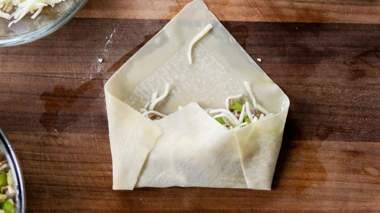 For starters, wrap just one egg roll at a time, reserving the other wrappers under a damp paper towel in the interim to keep them pliable. Place your first wrapper in front of you in a diamond orientation, flour side down, and add your filling. Next, egg wash a thick border along each side, then fold it into an open envelope shape. You can do this by folding the bottom edge up so that it just covers the filling and mirrors the top corner of the wrapper, then fold the two side corners in, too. From here, gently pick up the bottom of the envelope and roll it towards the open end so it forms a cylinder.