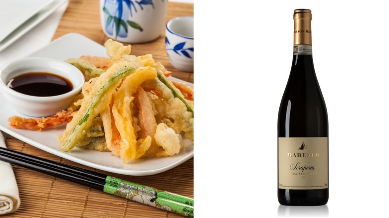 Enjoy this salty dish with a contrastingly sweet wine. Marenco Vini's Scrapona Moscato d'Asti DOCG is an excellent candidate for this duo. This bold wine features fruity notes of lime, apricot, passion fruit, and grape, alongside an herbal element and a floral finish. The gentle bubbles and light acidity help cleanse the palate, making this refreshing wine a suitable match for fried tempura veggies.