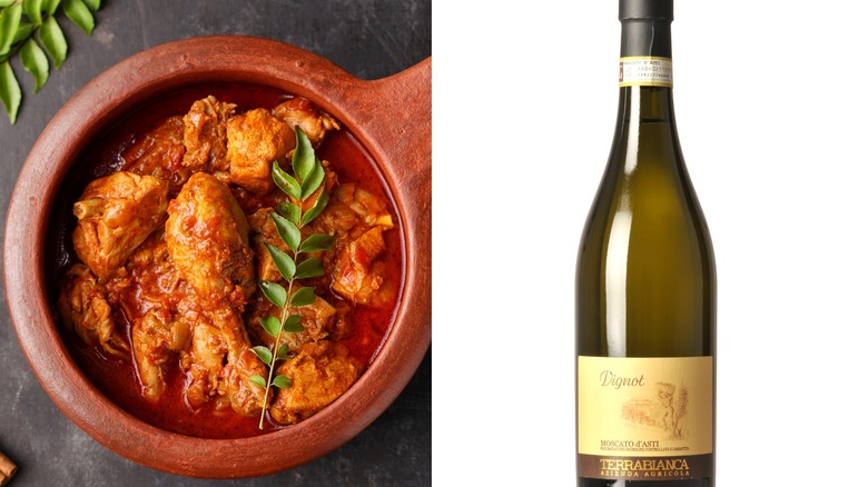 If you've ever paired a spicy curry with a tannic red wine and felt the inside of your mouth burn from the heat as you wince at the unpleasant bitterness, then you know better than to do that again. Curries combine a multitude of spices and fragrances to build up flavor, resulting in deliciously rich meals that rarely need more than a side of steamed white rice. Whether the flavor profile includes red curry paste, lemongrass, and galangal, or star anise, cumin, and Kashmiri chilis, you'll want a sweet or off-dry wine to subdue the heat.