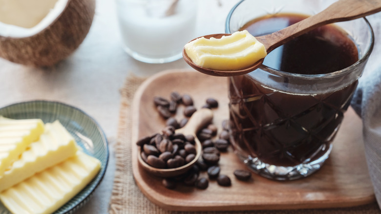 Thankfully, if black coffee isn't your thing, you've got options. While keto-friendly creamers, artificial sweeteners, and heavy whipping creams allow you to enjoy coffee guilt-free, one keto-friendly coffee addition rules them all: butter. Butter coffee, also known as "bulletproof coffee," was first introduced by entrepreneur Dave Asprey in 2009. There are many modified versions of butter coffee — the original recipe calls for a little grass-fed butter or ghee and MCT oil — though the idea remains the same. The added boost of fat supports ketosis while satiating hunger (potentially improving mental focus and increasing energy).
