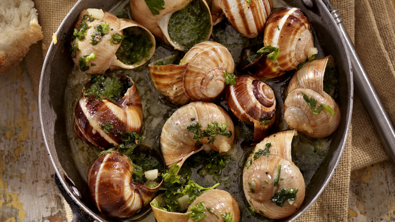 Escargot: the French dish that makes Americans scratch their heads in wonderment. The idea of popping a slimy, oozy snail into one's mouth isn't very appealing, and we're sure French diners would agree. That's what makes escargot so special and so woefully misunderstood. When you order the traditional dish at a real French bistro, you likely won't be chowing down on a garden-variety snail, and it probably won't be slimy. When done right, escargot tastes like an explosion of butter and garlic with a touch of earthiness. When it's truly authentic, the escargot has taken a long, highly selective journey to your plate. That's what makes them so rare — and so expensive.