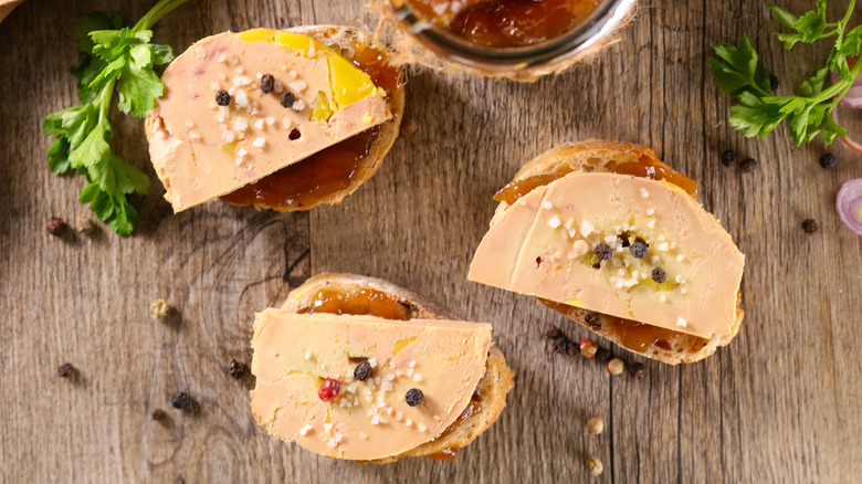 Foie gras translates to "fatty liver" in English, which is a fairly straightforward description of what it is: the liver of a fattened duck or goose. Though it can be a main dish, foie gras' gourmet status means it's expensive to produce, so a little goes a long way ... if it's accessible. Foie gras has been the subject of protests all over the world due to the controversial way birds are force-fed in order to develop fatty livers. This process, called gavage, leaves the birds vulnerable to infections and liver damage. The outcry against foie gras has led to the luxury food item being banned in several countries, including India and Australia.