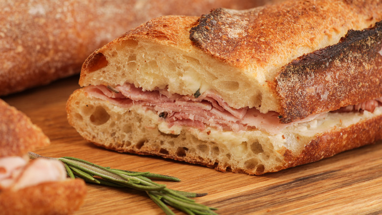 Composed solely of bread, butter, and cured ham, the classic French sandwich jambon-beurre (ham-butter) is easy to screw up. One errant ingredient and the whole sandwich can go from oui to non in une minute. First of all, super fresh ingredients are a must, which can be quite the effort for anyone hoping for a quick lunch. The best jambon-beurre is made with a freshly baked artisanal baguette and slathered with a generous amount of butter. And since we're dealing with high-quality ingredients here, it's best for the butter to be salted and have a high-fat content. You don't just use any ham in this sandwich, but jambon de Paris, a wet-cured ham with a distinctly smoky, briny flavor.