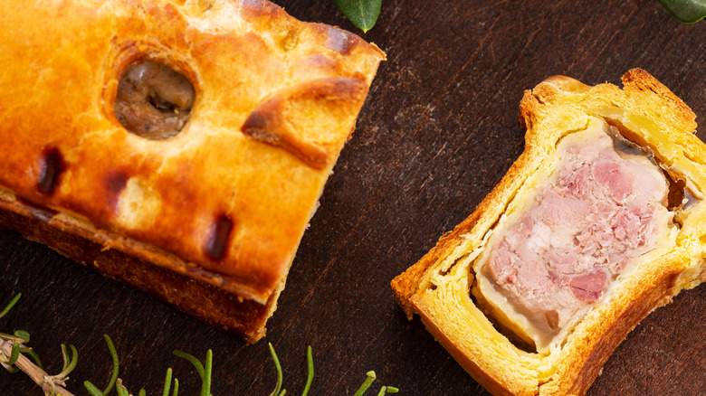 With its pale pink interior riddled with flecks of green and mystery ingredients, this dish doesn't reveal all its secrets at first glance. It's basically every picky eater's worst nightmare. What is it, exactly? Although "pâté" directly translates to "dough," this dish is not made with yeast and flour. It's more of a paste or filling composed of game meats like goose, duck, and pheasant — sometimes other meats are added to the grinder, like lamb and wild boar. The fact that this particular type of pâté is prepared en croûte means it's baked into a crust, like a thick, savory meat pie. It may not look very appetizing, but pâté en croûte is the height of gourmet cooking in France.