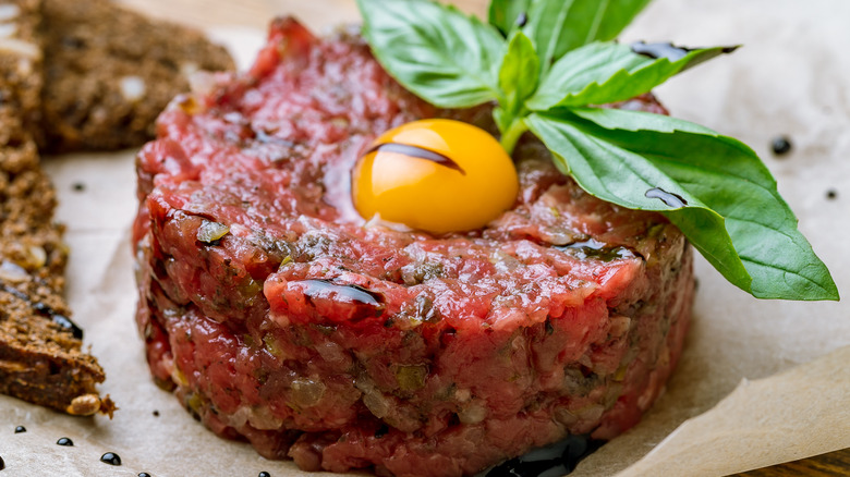 Everything in steak tartare is raw, from the finely chopped or minced steak to the yolk served atop the tartare like a glistening yellow eye. A varied combination of mustard, Worcestershire sauce, and tabasco hold the meat mixture together, along with savory ingredients like capers, pickles, and parsley. What you end up with is a meal fit for a classy carnivore; there's a reason steak tartare was once a snack of warriors. However, if you have a love for raw beef, you may want to rethink ordering it at a French bistro.
