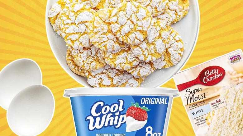 As the title suggests, one of the ingredients is, of course, Cool Whip, the whipped topping used for many desserts. The other two ingredients are an egg and a boxed cake mix of any flavor. Add one full container of Cool Whip with the egg and cake box mix, and stir until it's well combined. Then, form small balls of the mixture — about the size of a tablespoon — and lay them out on a baking sheet. Bake for 10 to 12 minutes at 350 degrees Fahrenheit. The result is a batch of soft, chewy, and fluffy cookies that are just as tasty as any more complex cookie recipe out there.