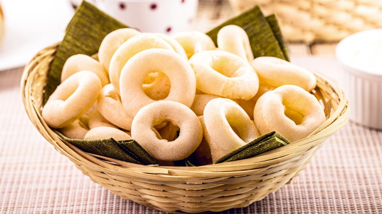 Biscoito de polvilho (pronounced bee-SKOHY-toh dee pohl-VEE-lyoh), more snack than meal, offers a crunchy bite of Brazilian food culture. Hailing from the state of Minas Gerais and dating back to colonial times, these airy, starchy morsels are now commonplace. Can you guess what kind of starch they're made from? Tapioca, of course! Only in this case, it's fermented first, lending the cookies a lightly tangy flavor. Eggs, milk, and vegetable oil contribute to their unique puffiness and a crunchy exterior.