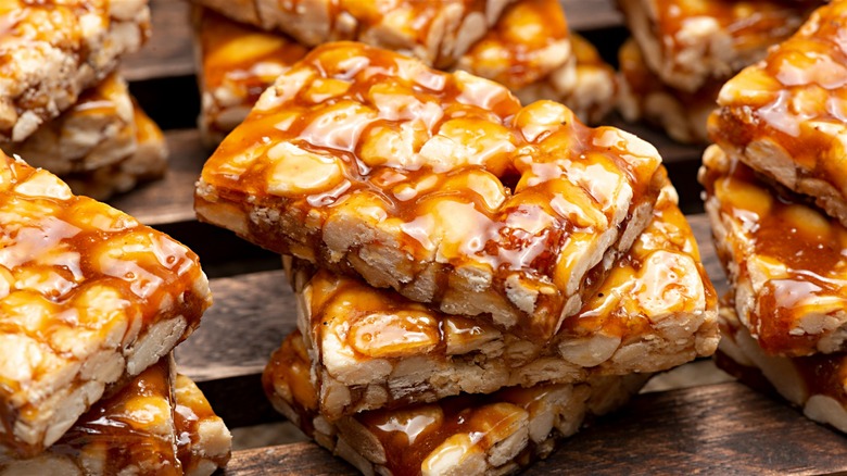 This crunchy peanut brittle is a staple during Festa Junina but cherished year-round. At its core, pé-de-moleque is a simple confection made from roasted peanuts embedded in a hard caramel, crafted from molasses or rapadura (unrefined whole cane sugar), which gives it a distinctively rich, smoky sweetness. It's an affordable indulgence found everywhere, from street vendors to high-end confectionery stores.