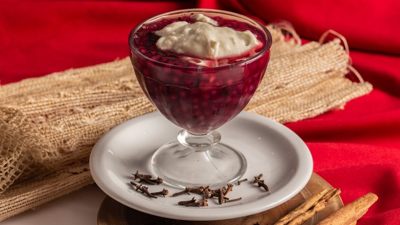 Sagu de vinho tinto is a cherished dessert in the southern regions of Brazil, where European influence is palpable in its culinary traditions. This isn't your average bubble tea ─ each bite is a journey to the wine-soaked heart of southern Brazil. This traditional tapioca pearl pudding, often served with an optional dollop of créme anglaise, is easy to whip up at home, and naturally plant-based (provided you use vegan wine).