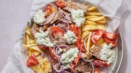 Gyro meat and fixings like creamy tzatziki, fresh tomatoes, sliced red onions, crumbled feta cheese, and sometimes a squirt of lemon juice are typically wrapped in warm pita bread and served as a sandwich. At some Greek eateries, you might be given the option to order a gyro platter, where the meat and toppings are then paired with fries on the side. Actually, we think steakhouse fries are the ideal vessel for the flavorful ingredients, so why not swap out the pita bread for spuds and make loaded fries? Then you can serve this killer dish as an innovative appetizer at your next casual dinner party.