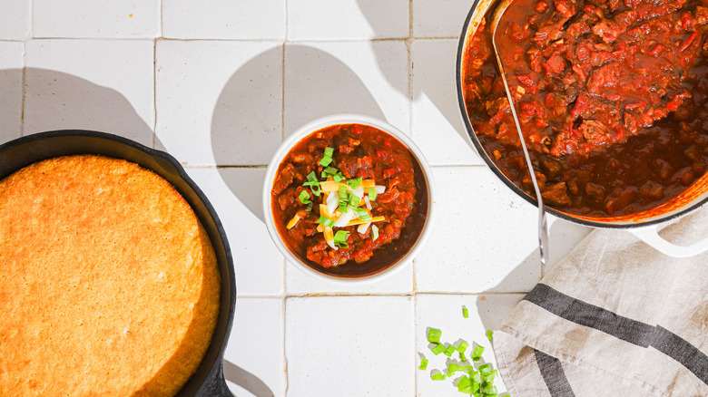 Like other peppers, ancho chiles need to be stemmed and seeded first. To incorporate ancho chiles into your chili with Tasting Table's recipe, Murray soaks the dried chilis, blends them with some of the liquid, and then adds them to the pot with tomatoes to create a base. You could also cut the seeded ancho chiles and saute them in the pot with garlic and onion. If you prefer less prep work or want a milder heat level, use ancho chile powder in the chili with other seasonings like chili powder or cayenne pepper instead.
