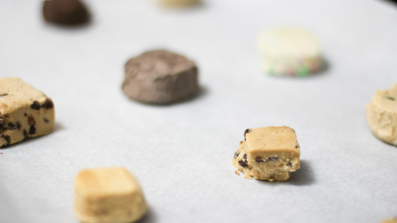 It's hard to resist a plate of freshly baked cookies. The inviting, brown sugar smell and the feeling of the chocolate chips melting on your fingertips just seal the deal for us. But you don't have to pull out your Kitchen Aid stand mixer and set your ingredients out at room temperature to have a batch of freshly baked cookies ready in a jiffy — you can just pick up a package of break-and-bake, store-bought cookie dough from the refrigerator section instead. To bake these cookies, just break off a square, pop it on a baking sheet, and wait for a little over 10 minutes for the easiest batch of cookies you have ever made. You don't even have to wash a cookie scoop!