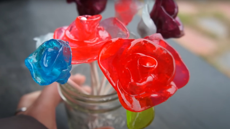When you're ready for a more involved flower-making candy project, you can melt Jolly Ranchers and use the pieces to form glass-like blooms with the melted candy. This process will take a bit more time, as melting the candy pieces and forming rose buds requires patience, but the glossy effect makes for an impressive presentation. Once the candy is soft to the touch (but not liquid), simply work the Jolly Rancher between your fingers until a petal forms. Fast as you can, wrap the petal around a lollipop stick, pulling each petal back slightly to create a rose effect.