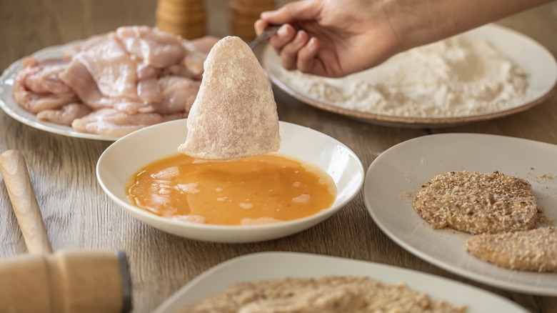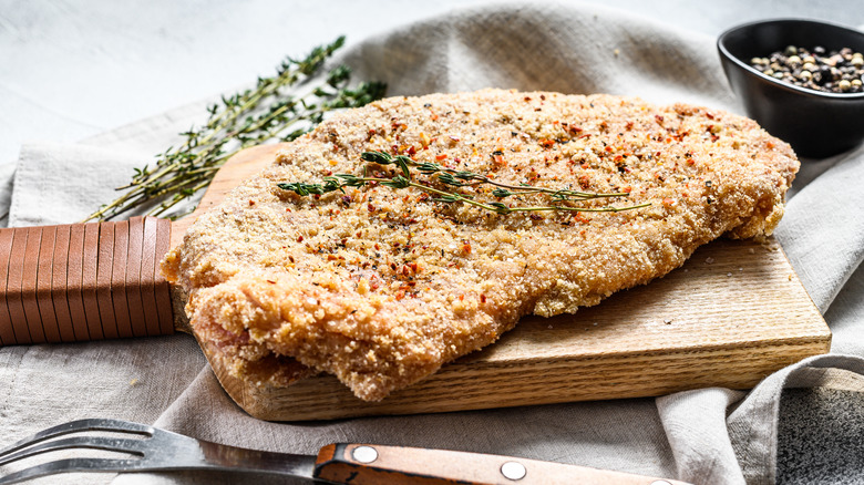 To maximize the potential of chicken breast for schnitzel, preparation is key. While we've already pointed out that chicken breast has a near-ideal shape for schnitzel, that doesn't mean it doesn't need some coaxing to optimize cooking. One method involves pounding the chicken breast thin and even to achieve quick frying and a more uniform shape. Using a meat mallet or rolling pin, flatten the chicken breast to an even thickness between two sheets of plastic wrap, ensuring uniformity for consistent cooking.