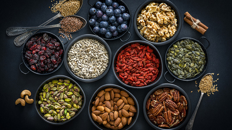 Not only do these options provide the texture component, but they offer new flavor profiles and even added nutritional benefits — especially in the case of seeds and nuts. Some options on this front include pumpkin seeds, sesame seeds, flax seeds, chia seeds, poppy seeds, and sunflower seeds, as well as sliced almonds, cashews, walnuts, pecans, and peanuts. These ingredients in particular work well because, unlike the lettuce, they will not get soggy once the dressing is added, ensuring you have crunchy bites to the very bottom of the bowl. If you want to get something especially different, other mix-ins to add a crunch to your salad could include crispy chickpeas, bacon (make sure it's well done, of course), cereal, or even chips.