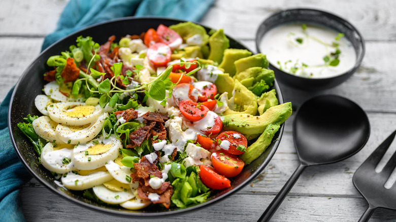 If you're planning to make this your meal, and not just a side, be sure to make it filling — and do that by adding some protein. High-protein meals are more satiating than meals that are high in carbohydrates or high in fat, meaning you will stay full for longer. The good news is you really can't go wrong regarding the type of protein you add, whether it's an animal protein like chicken, shrimp, steak, or salmon, or ingredients such as lentils, nuts, eggs, or plant-based meat substitutes. One other way to up the protein in your salad is by incorporating Greek yogurt into your homemade salad dressing.