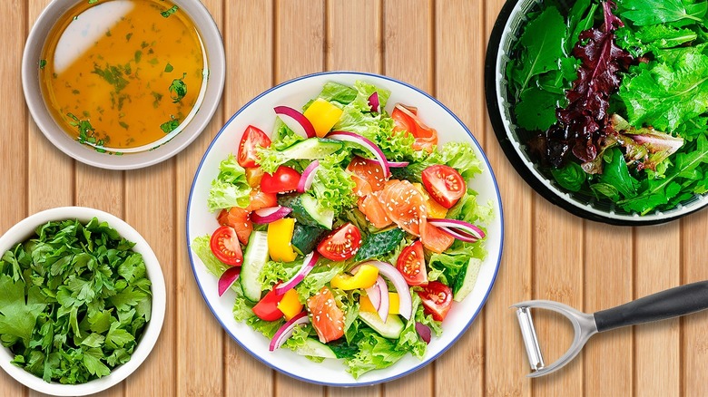 Salad, in its most basic form, usually comprises some lettuce, croutons, maybe a few mix-ins, and a dressing. There's certainly nothing wrong with that, but there is a whole world of possibilities out there that will have you wondering why you didn't try these sooner. These hacks range from changing out the type of greens (or swapping them out entirely) and assembling the salad to look more presentable to making it more filling and ensuring it stays fresh longer. With the following tips, you can revolutionize your salad game — making them full of vibrant colors, contrasting textures, and diverse ingredients that are both full of flavor and heavy on health benefits. Even if you're well-versed in the salad-making arts, no doubt one of the insights below will ignite a spark, leading to your next favorite "I-can't-stop-eating-this" salad.