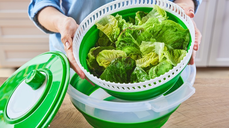 But if you've ever tried drying lettuce after washing it, you know that can be a bit of a challenge. There are plenty of crevices to get to and water can stay trapped there, even after drying with a towel — and nothing is worse than soggy lettuce because texture is also a major component of how we enjoy food. Running lettuce (or other produce) through a salad spinner after washing will help remove excess water, keeping your greens and other ingredients crisp. Drying out your lettuce will also help it remain fresh longer, as wet greens will wilt faster, even if otherwise stored properly. If you're meal-prepping, this is a crucial step to having a fresh salad each day. Plus, there are plenty of other uses for your salad spinner besides nights when you're not washing veggies.