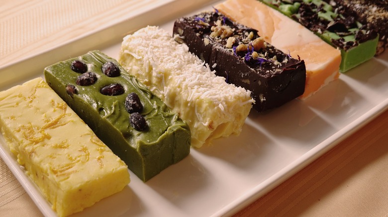 While there is a little room to experiment with ganache, that door is blown wide open when it comes to fudge. Because you're making cubed desserts, you can incorporate chunkier mix-ins to create just about any flavor you can think of. Feel free to test out nut butters like peanut or cashew, chopped nuts, peppermint candy, toffee, dried fruit bits, cookie crumbles, or crushed cereal. While ganache typically only acts as a dessert sidekick, fudge can be tailored to a specific occasion or holiday. Whip up pumpkin pie fudge during the fall, for instance, or a cake batter version for a birthday.
