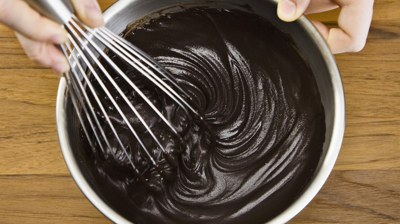 On the flip side, ganache is much easier to make — as it should be, since it's typically just an accent on a dessert, not the star of the show. Generally, you'll want to use dark chocolate here. It's possible to make milk or white chocolate ganache, but you may have to adjust the cream ratios according to the chocolate type. The cream involved is usually heavy cream, although you can substitute it with a milk and butter combination. The ratio of the two matters — typically, you'll want equal parts chocolate and cream, although you can also use twice as much chocolate as cream if you want a thicker, paste-like consistency.