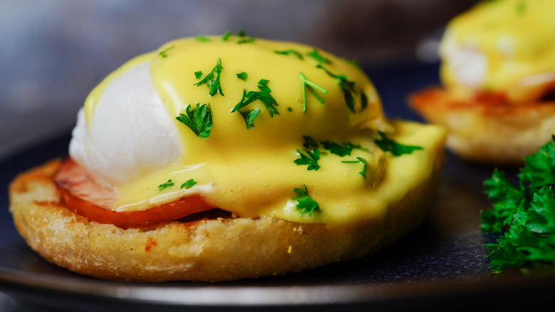 However, if your sauce is splitting, meaning that the oil and water are separating, don't worry — it can be saved. One solid trick to rescue broken hollandaise sauce is to bring it back into emulsion by adding a little water. Bring some water to a boil and, using very small measurements (we're talking tablespoons), whisk in a little bit of hot water at a time to bring the sauce back together. Make sure the water you're adding isn't too hot, or you risk curdling your hollandaise.