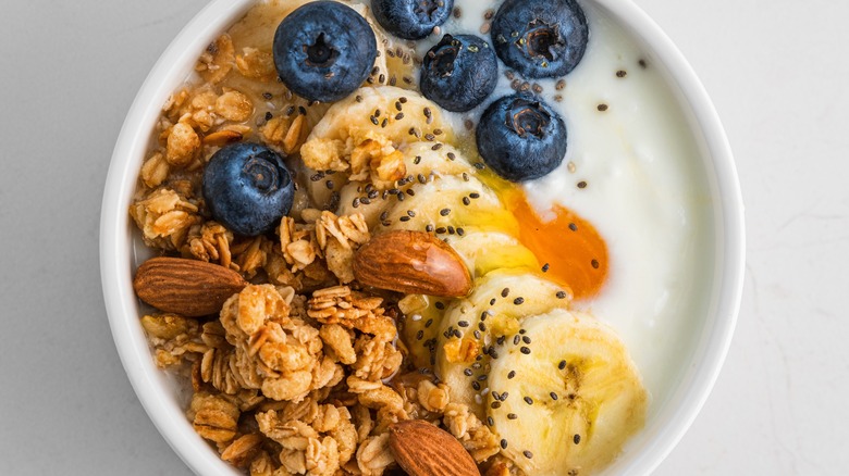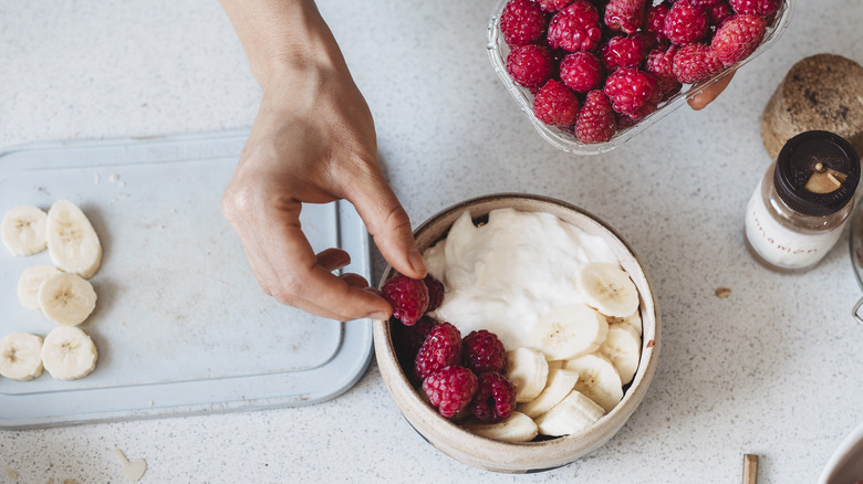 Fruit and yogurt go hand-in-hand, like peanut butter and jelly or apples and cinnamon. There are plenty sorts of fruit-infused yogurts, but you can easily make the same delight at home. Mixing in fresh fruit such as blueberries will give it a stunning blue-purple hue, a light sweetness, and a nice pop with each bite. Sliced strawberries, bananas, or kiwis also make colorful additions. If you have the extra time to blend or purée the fruit, it'll result in a smooth yogurt.