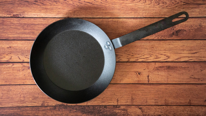 Unlike cast iron, there's an additional step when seasoning carbon steel cookware. If it's brand spanking new, the wax coating must be removed first. You can begin the actual seasoning once it's wax-free. For a medium-sized pan, use two potatoes, ⅓ cup of oil, and ⅔ cup of salt. Potato peels help the heat distribute more evenly, which lowers the chances of lumps in the seasoning layer. You can adjust the potato count to the size of the pot or pan. The whole process should last no longer than 15 minutes, give or take.