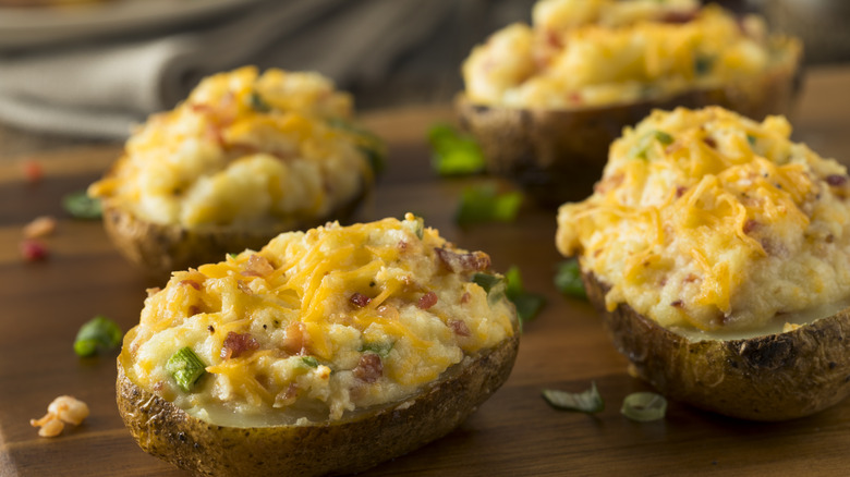 A flawless baked potato is like biting into a puffy cloud of deliciousness. They are the pot of gold waiting for patient home chefs at the end of the culinary rainbow. And thanks to someone truly virtuous, twice-baked potatoes exist. They take twice as long to bake and are twice as tasty. Beautiful and bulbous, the sight alone is enough to inspire hunger pangs. Making twice-baked potatoes is a sustainable and flavorful way to use both the flesh and the skin. It's like combining mashed, baked, and potato skins all into one scrumptious meal.