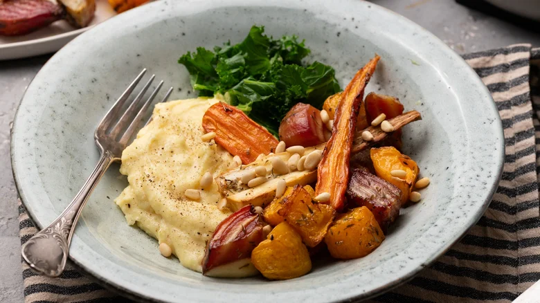 Roasted vegetables become caramelized and slightly sweet, adding different textures and taste profiles to a creamy polenta. We love choosing a selection of root veggies like carrots, beets, and parsnips to make this colorful roasted root vegetable polenta recipe. Paired with a cheesy polenta, this makes for a hearty and nutritious weeknight meal. The added pine nuts match the nutty flavor in the polenta, and add an extra layer of decadence.