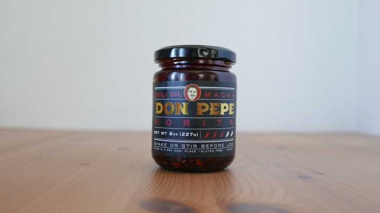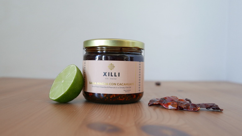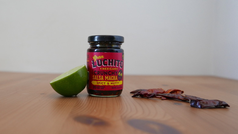 While Gran Luchito contains some agave syrup, it remains one of the least sweet sauces on our list. Instead, the focus is on the bolder, more savory end of the salsa macha flavor spectrum. The chunky texture isn't diluted by too much oil but rather just enough to make it the perfect vessel for umami flavors and oily peanuts. The bold inclusion of garlic chunks pairs well with the hot chiles and ensures no vampires will knock on your door tonight. Gran Luchito, which is handmade in Mexico, is the real deal regarding a hot, savory salsa macha.
