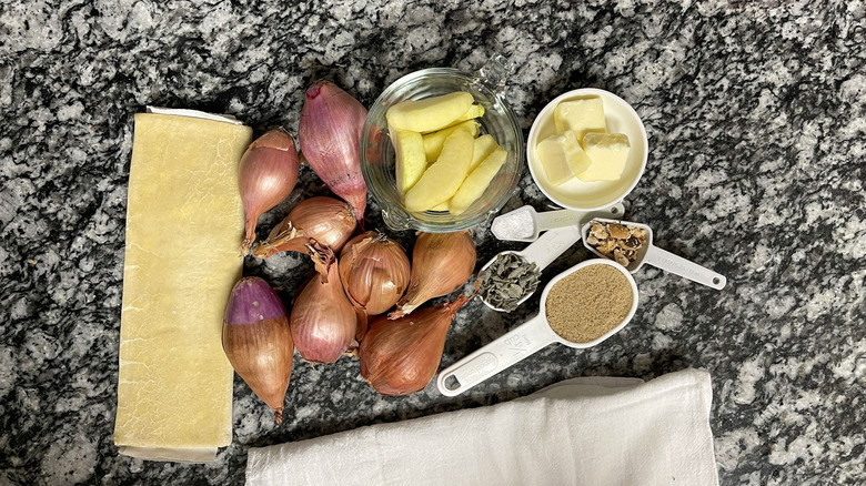Collect the ingredients to make crispy, caramelly shallot and apple tarte tatin