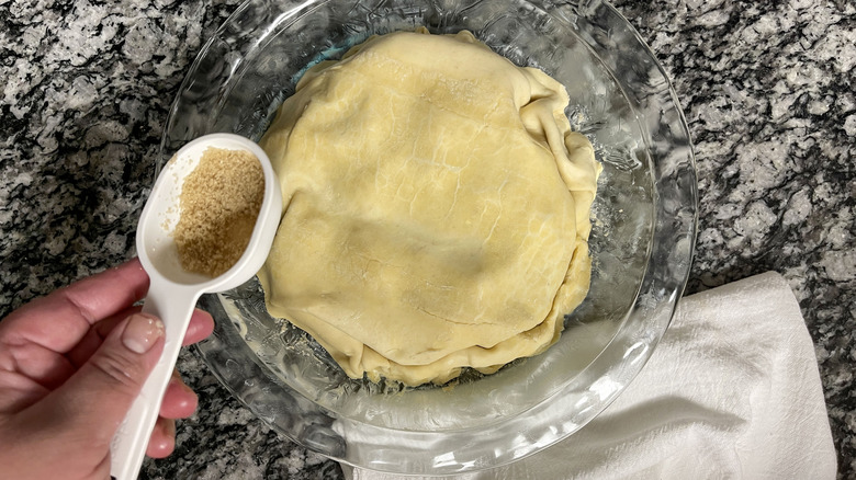- Sprinkle the remaining brown sugar over the pastry and use a knife to cut several slits to allow steam to release through the crust.