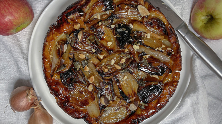 Tarte tatin is a classic, only seemingly fancy French dessert that is typically made of apples — like an apple pie without the top crust. Like most tarts, tarte tatin is actually easier for casual home bakers to make than two-crust pies, and recipe developer Kara Barrett's tarte tatin is especially foolproof because she uses ready-made puff pastry instead of whipping up the tarte shell from scratch. What really makes this recipe stand out, however, is the addition of shallots to the not-too-sweet apple filling.