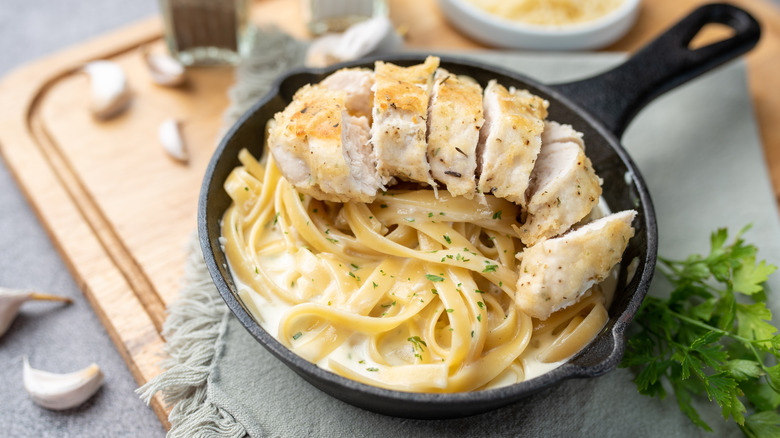 From zesty tomato sauce to meaty ragu or herby garlic and oil, a hearty plate of pasta serves as the perfect canvas for a slew of flavorful toppings. But if you're craving something particularly rich for dinner, you can't go wrong with a classic Alfredo sauce. It's cheesy, creamy, and oh-so-decadent, and it pairs well with just about any type of noodle you've got on hand, including bow-tie farfalle, tubular penne, or its most traditional pairing, long strips of fettuccine.